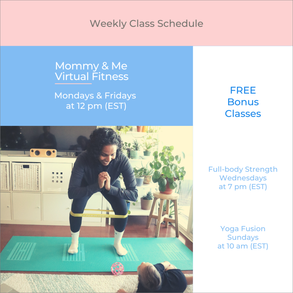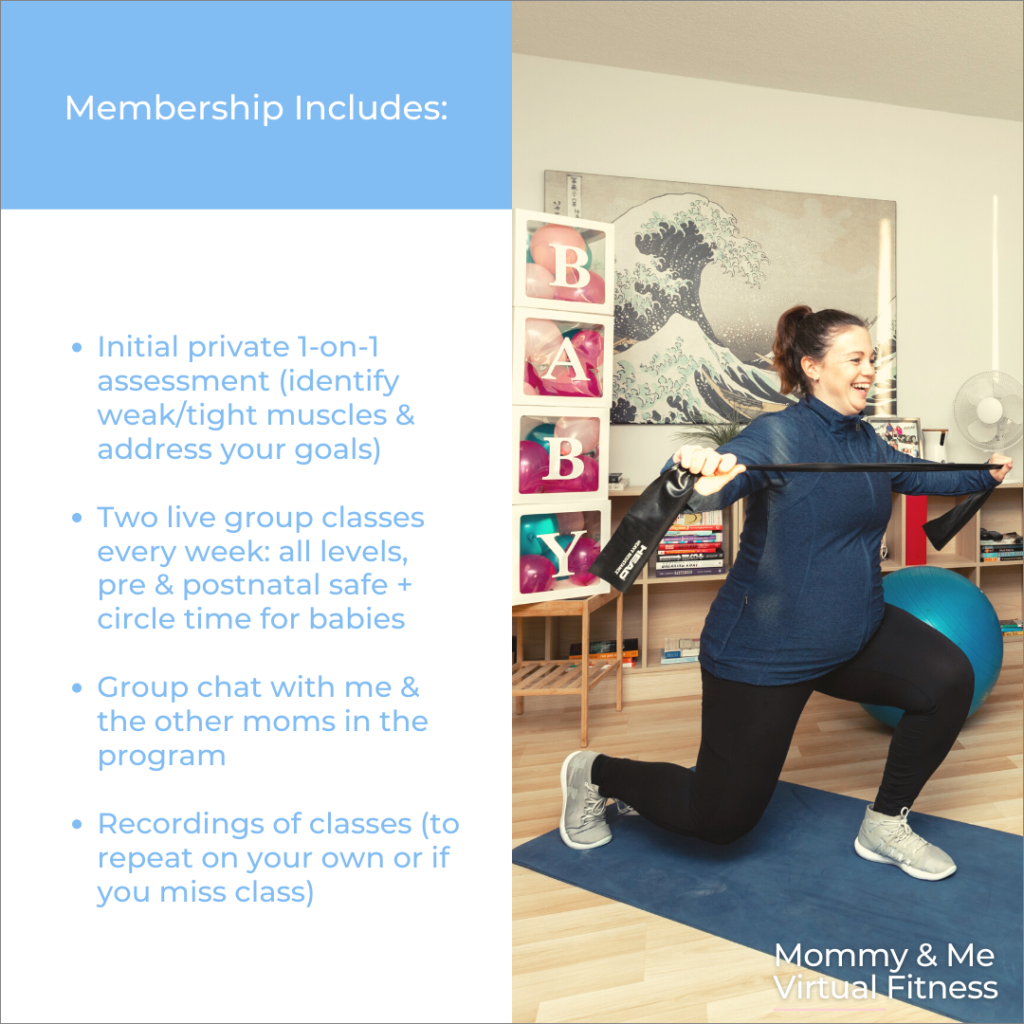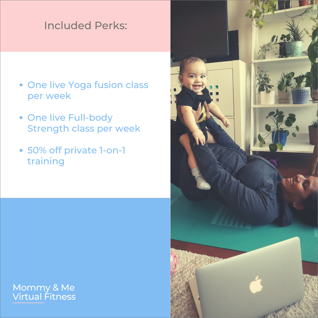 Each week, you get 2 Mommy & Me Classes, plus 2 bonus fitness classes, plus 1 group coaching + accountability session. You can join as many or as few classes, and enjoy as many of the bonus membership perks as you like.